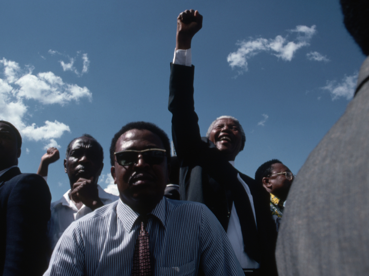Les gardes du corps surveillent de près la célébration par Nelson Mandela de sa victoire à l'élection présidentielle sud-africaine de 1994. En tant que président du Congrès national africain, il a contribué à la construction du nouveau gouvernement multiracial du pays et à l'organisation d'élections libres au cours desquelles il a remporté la présidence.
