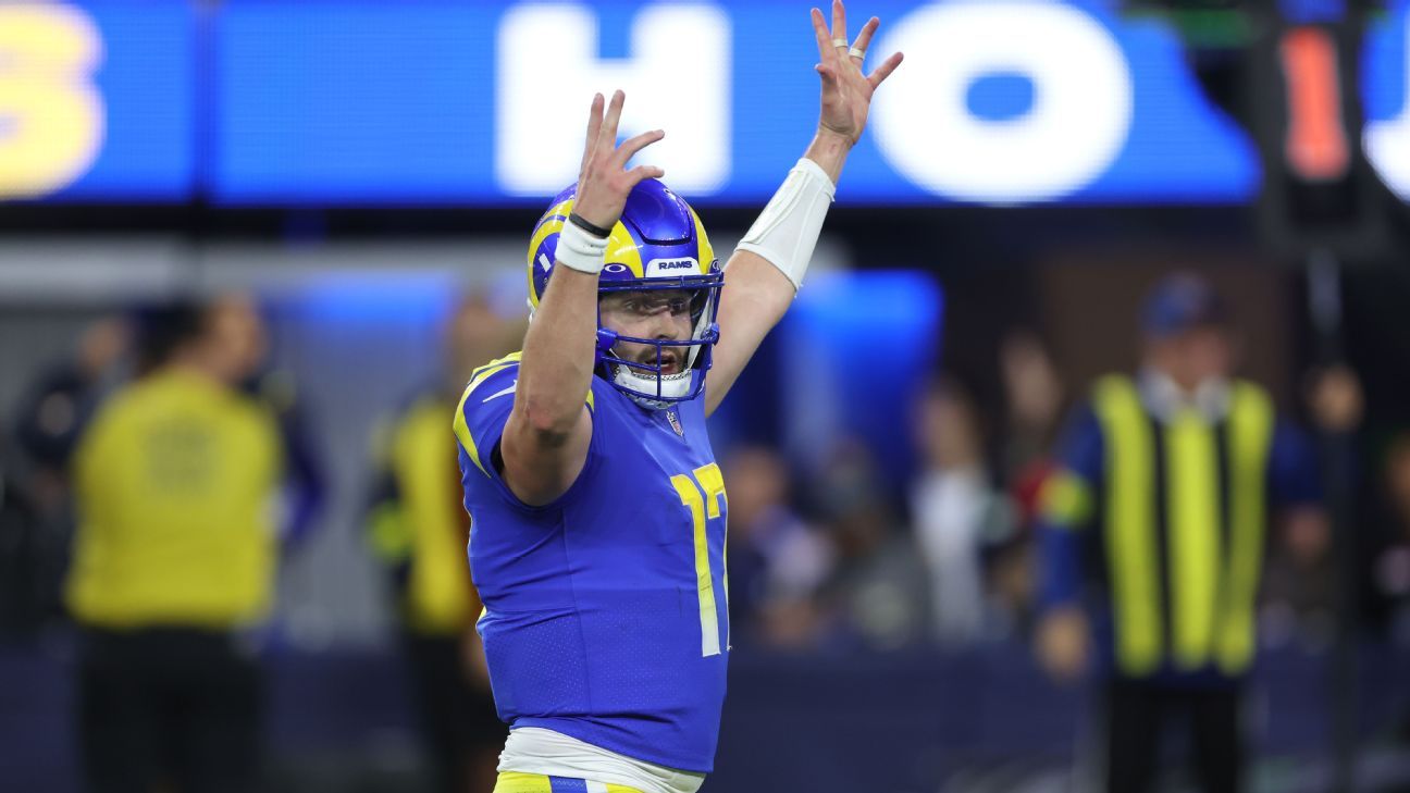 après l’arrêt Derek Carr Avec les Raiders sur l’avertissement de deux minutes, les Rams se sont retrouvés dans une position précaire lorsque AJ Cole Un coup de pied de 64 verges a chuté aux Rams 2. Sans temps mort, Mayfield a conduit les Rams sur le terrain et a atteint leur propre 23 pour les départs avec 15 secondes à jouer dans le match. Puis Mayfield s’est connecté avec Jefferson dans le coin arrière de la zone des buts.