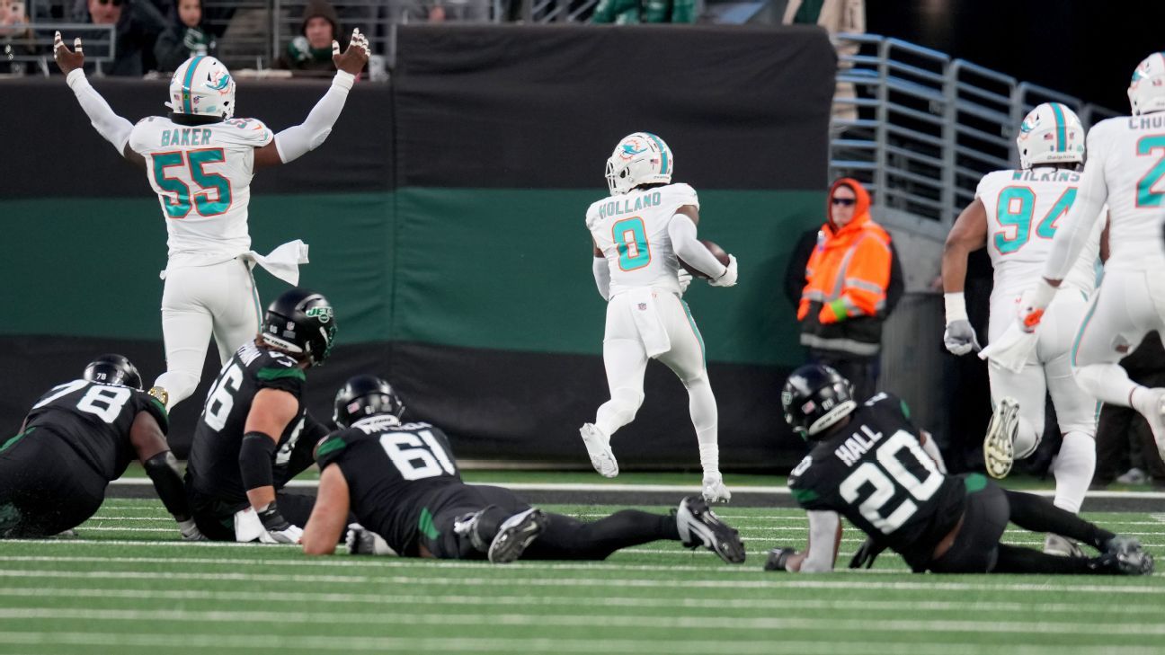 Holland a intercepté la passe et l’a renvoyée sur 99 verges pour un touché lors de la victoire finale 34-13 des Dolphins au MetLife Stadium, aspirant l’air du public local à chaque pas qu’il faisait en cours de route. C’était le premier retour de Je vous salue Marie pour un touché depuis qu’ESPN a commencé à suivre le jeu en 2006.
